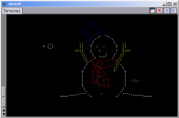 1 use Term::Animation; 2 use Curses; 3 4 #You may need to disable color for lamer terminals 5 (my $anim = Term::Animation->new)->color(1); 6 7 #Build a snowman 8 $anim->new_entity( 9 position => [25, 2, 10], 10 shape => do{ read(DATA, $_, 557); $_ }, 11 color => do{ read(DATA, $_, 426); $_ } 12 ); 13 #Discard comment 14 seek(DATA, 49, 1); 15 16 #Pack a projectile 17 $snowball = [ do{ read(DATA, $_, 11); $_ }, do{ read(DATA, $_, 7); $_ } ]; 18 19 #Lob it 20 $anim->new_entity( 21 shape => $snowball, 22 position => [-3, 6, 2], 23 callback_args => [0, $anim->gen_path( 0,9,2, #begin 24 47,9,2, #end 25 [(0)x6,1], #change 26 my $step=7)] ); 27 halfdelay(2); 28 getch() && $anim->animate() for( 1..$step ); 29 sleep 3 && $anim->end(); 30 31 __DATA__ 32 .-~~\ 33 / \ _ 34 ~x .-~_)_ 35 ~x".-~ ~-. 36 ,. ( / \ ,. 37 || T o o Y || 38 ==:l l < ! I;== 39 \\ \ .__/ / // 40 \\ ,r"-,___.-'r.// 41 }^ \.( ) _.'//. 42 / }~Xi--~ // \ 43 Y Y I\ \ " Y 44 | | |o\ \ | 45 | l_l Y T | -Row 46 l "o l_j ! 47 \ / 48 ___,.---^. o .^---.._____ 49 "~~~ " ~ ~~~" 50 bbbbb 51 b b b 52 bb bbbbb 53 bbb 54 yy b yy 55 yy K K yy 56 yyyy Y yyyy 57 yy yy 58 yy r rrrrrrr R yy 59 RRR R RRRRyy 60 RRRRRRR yy 61 R RR R r 62 R RKr R 63 RRR R R KKKK 64 rK RRR 65 66 K #Some terminals don't do light black 67 _ 68 = (_) 69 _ 70 (_|